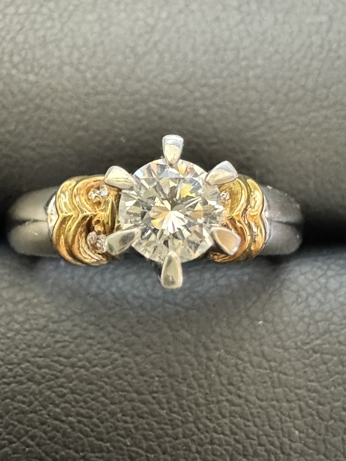 このたびダイヤモンドがセッティングされたリングをお買取りいたしました。中央には存在感のあるダイヤモンドがあしらわれており、輝きや透明感がしっかりと感じられるお品物です。枠部分には異なる素材が使われ、デザイン性と高級感を兼ね備えたリングとして評価させていただきました。