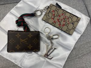 ヴィトンのモノグラム・オーガナイザードゥポッシュというパスケース、同じくヴィトンのポルトクレ・イニシャルLVのキーホルダー、そしてグッチのGGスプリーム・キングスネークプリントのコインケースです。