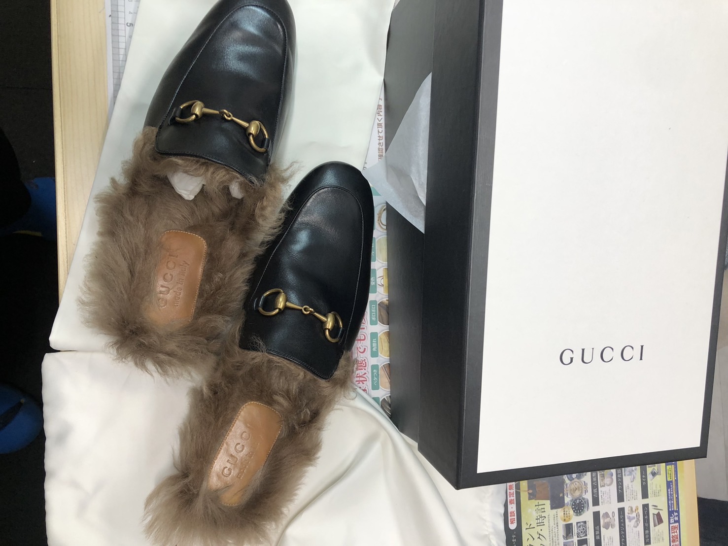 グッチ(GUCCI) ホースビットファーミュール のお持ち込みとなります。当店では、高級ブランドアパレル類は、他店対抗の高額レートでお買取りさせていただいております。西武新宿線沿線の方々が遠方より数多くご来店いただいておりますので、1点からでもご対応させていただいておりますので、ぜひ高級ブランドアパレル類は当店までお持ち込みください。このお品物も他店より高額の査定にて、お客様お喜びの高価買取となりました。