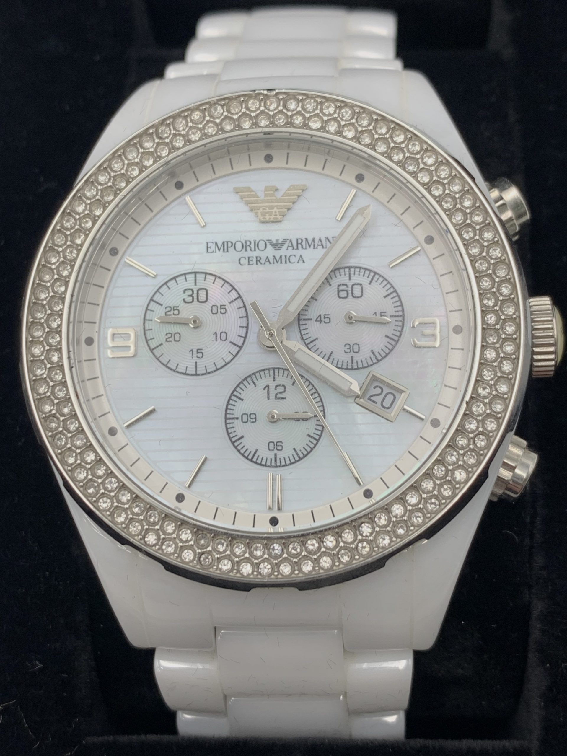 アルマーニといえば、スーツや香水、お酒などでもその名を知られる、洗練された大人の代名詞。今回お持ちいただいたのは、そのラインナップの中でも特に根強い人気を誇る「セラミカ」シリーズです。