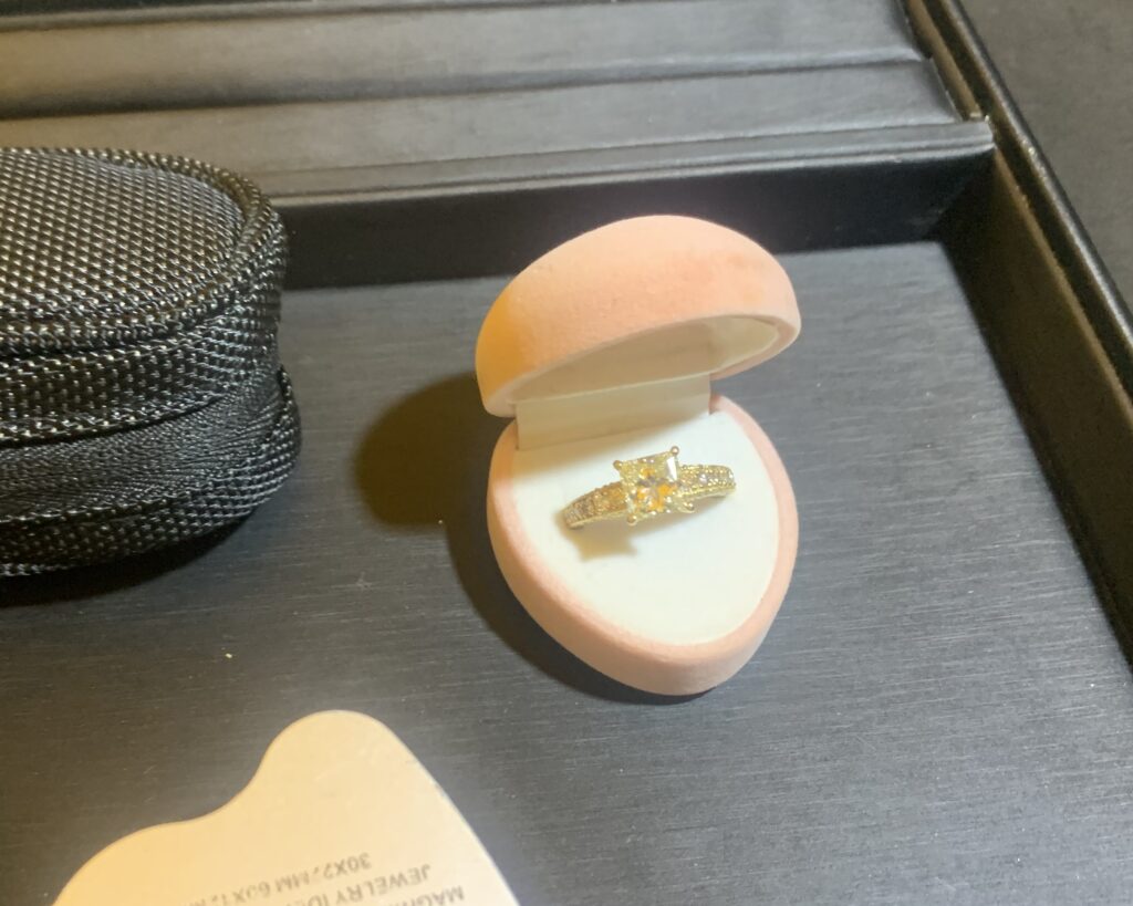 センターには大きめのプリンセスカットダイヤモンド。シャープな直線と面の輝きが特徴のカットで、ラウンドブリリアントとはまた違った、キリッとした煌めきが魅力です。さらに脇石にもダイヤがしっかりセッティングされており、トータルでなんと2.4ct。数字だけ見ても迫力がありますが、実物はやはり別格でした。