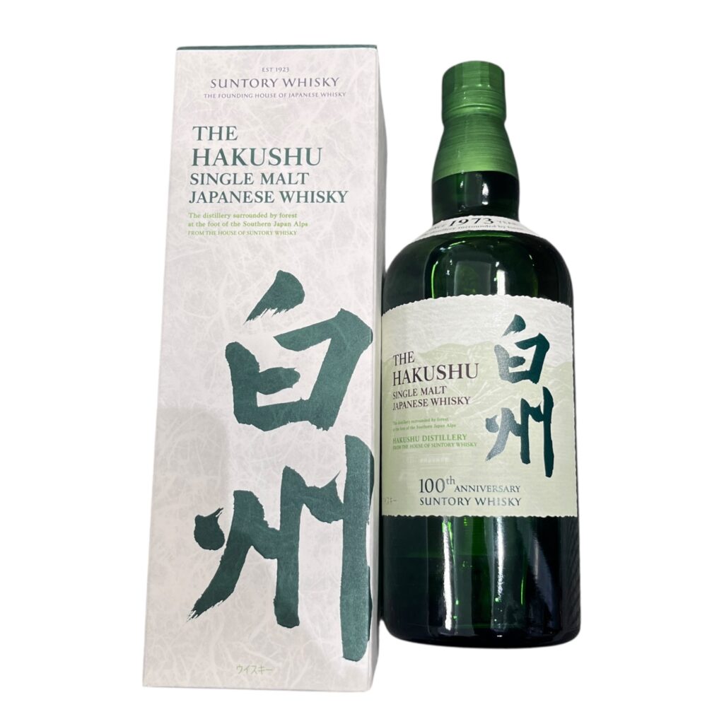 白州は、言わずと知れたサントリーのシングルモルト。森の蒸溜所として知られ、軽やかで爽やかなスモーキーさが特徴です。今回の100周年記念ラベルは、ブランドの節目を記念してリリースされた特別仕様。通常ラベルとは異なるデザインで、コレクション需要も高い一本です。