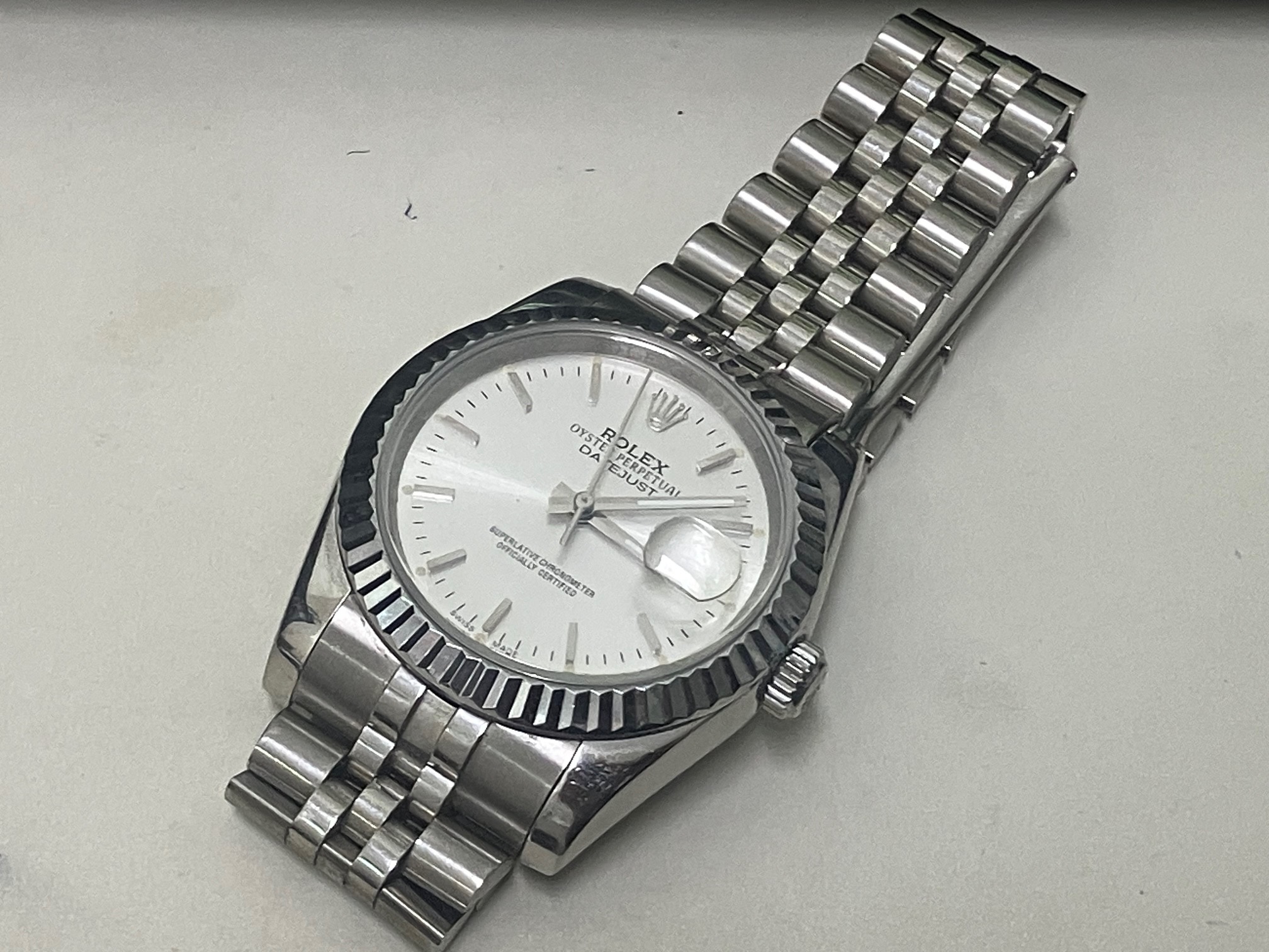 今回はメンズのデイトジャストです。白文字盤の使いやすいタイプですね。