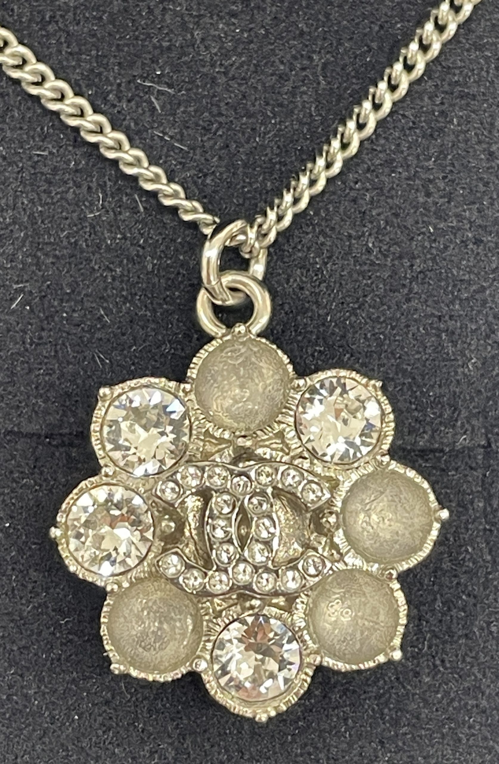 CHANEL シャネル ラインストーン ロング ネックレス フラワー ロゴ ペンダント アクセサリーです。
