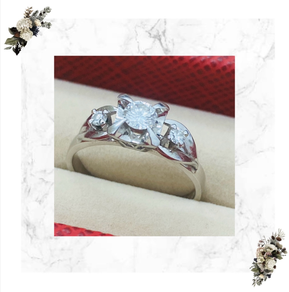 今回はpt900(プラチナ)の台座に3石のダイヤモンドがあしらわれた