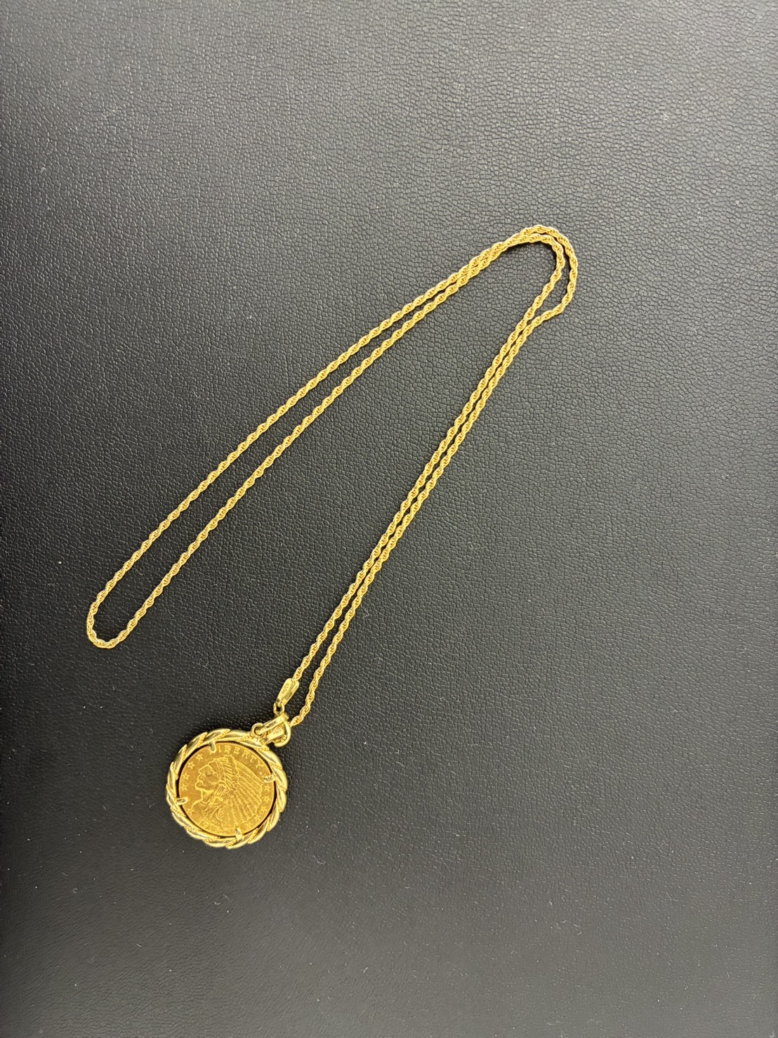 こちらのネックレスには、インディアン金貨が用いられており、インディアン金貨には、10ドル、5ドル、2.5ドルの3種類があります。 10ドルは通称イーグル、5ドルはハーフ イーグル、2.5ドルはクォーター イーグルと呼ばれています。 また、2.5ドルと5ドルのデザインをオールド インディアン、10ドルをヤング インディアンと呼ぶ場合もありますが、正確には10ドルはインディアンではなく、インディアンの羽飾りをつけた自由の女神がデザインされています。ぜひコイン付きのネックレス買取強化しておりますので、お持ちの際はご来店お待ちしております。