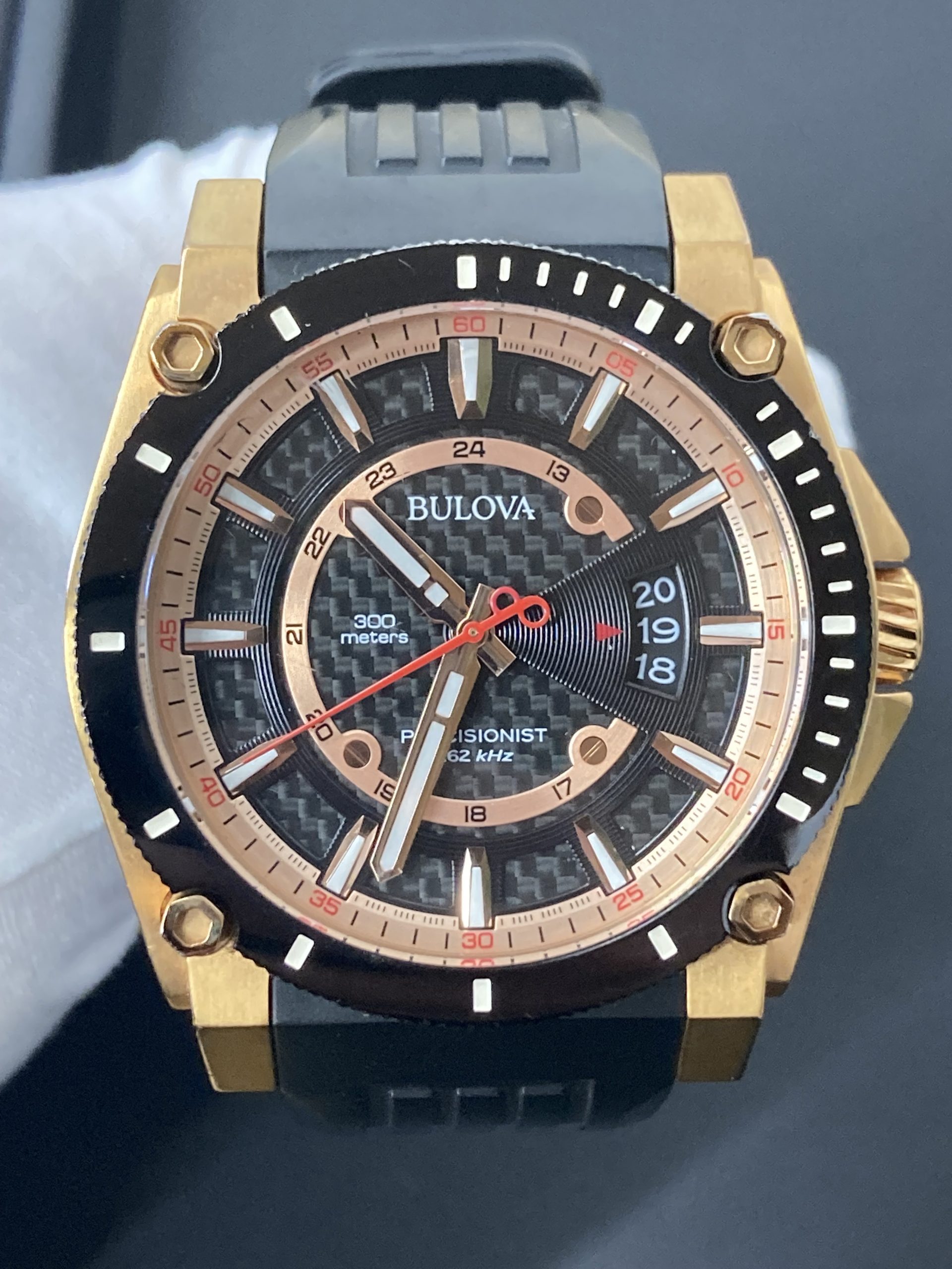 状態: カーボン素材の文字盤と、ベゼルのゴールドカラーが映える、非常に存在感のある良品です。