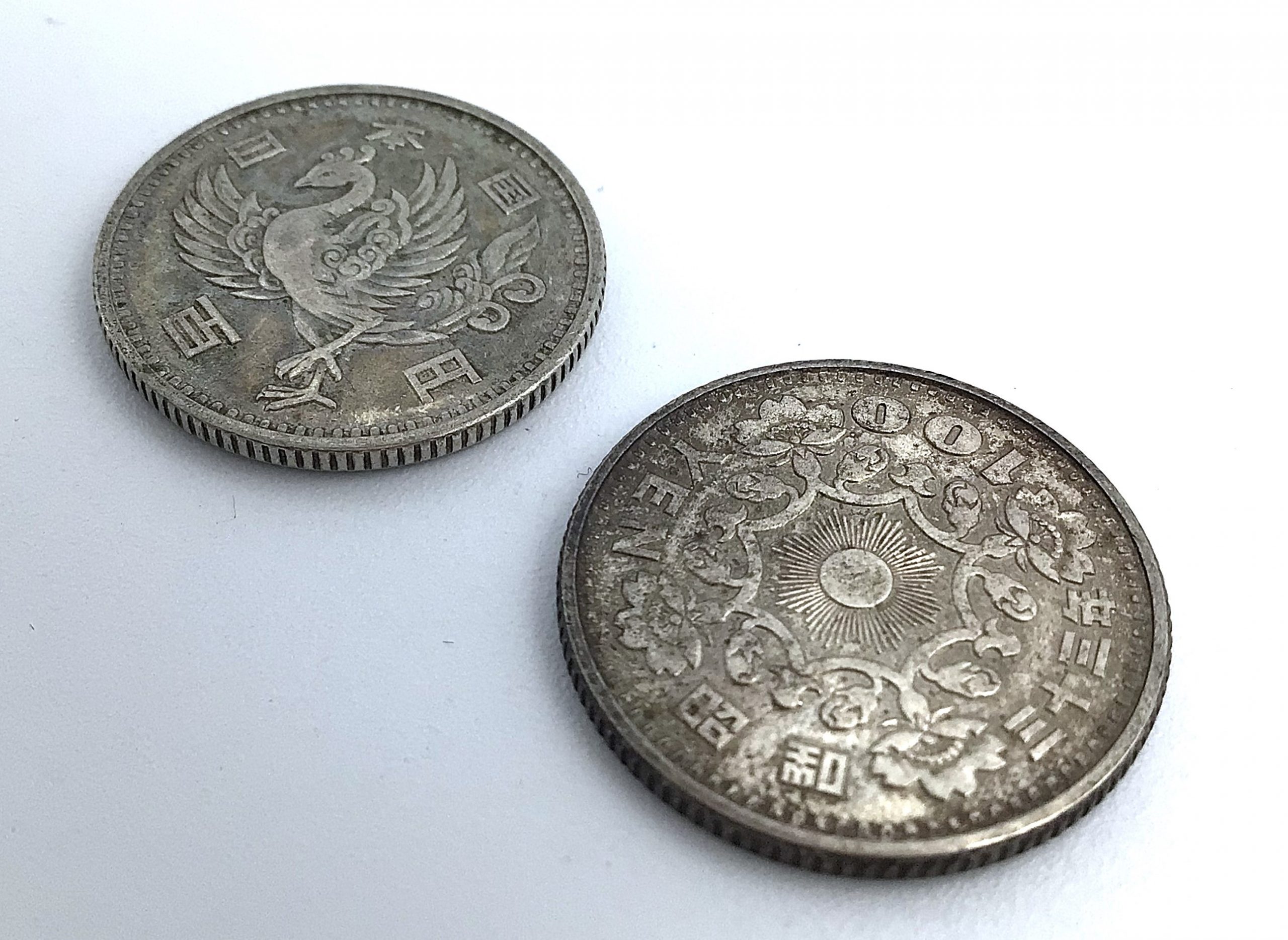 現行の硬貨は白銅製のものが多いですが、この硬貨は銀の地金の価値が付き100円以上で取引されています。