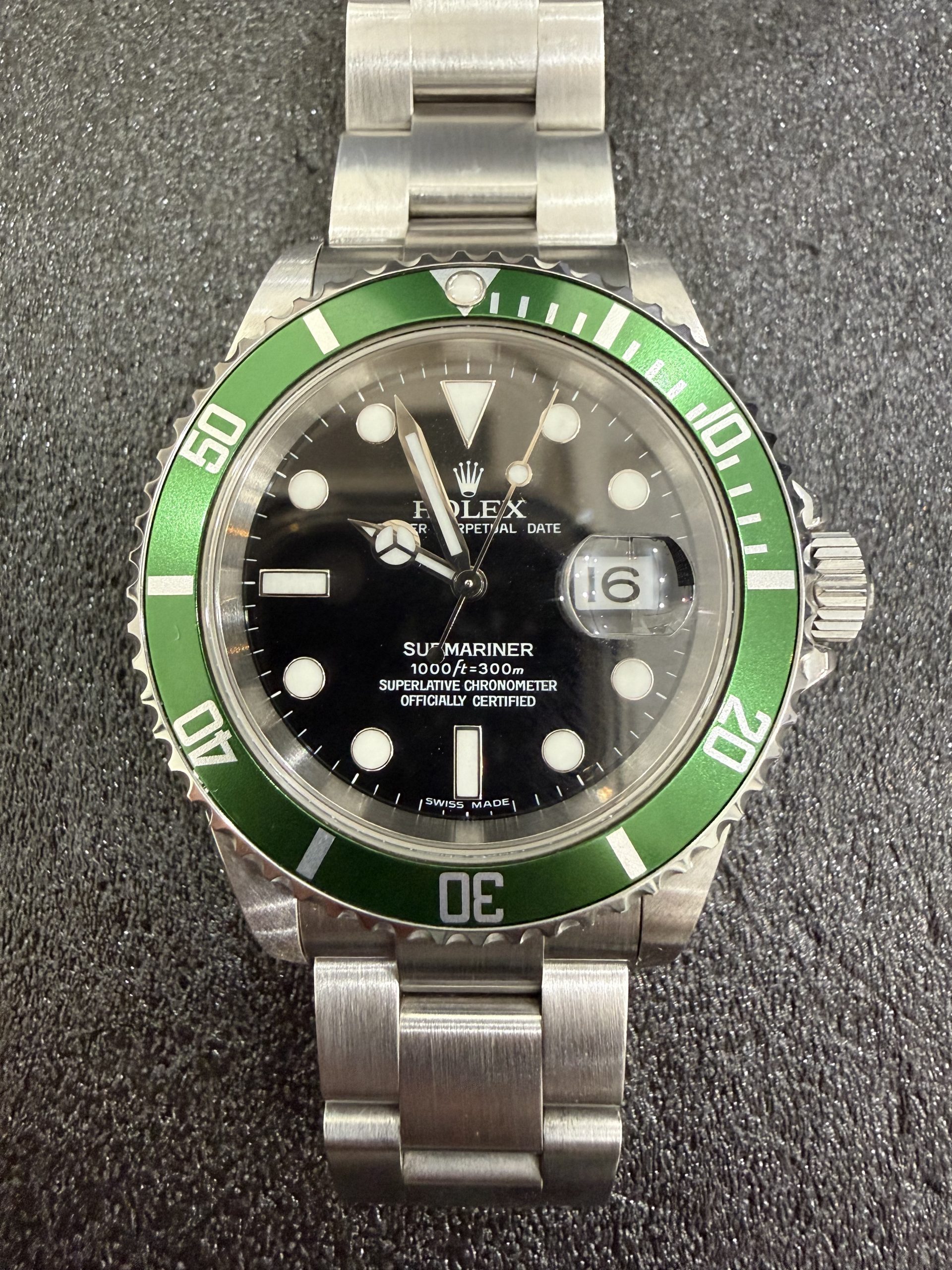 グリーンベゼルが特徴のこのモデルは、通称「グリーンサブ」と呼ばれる人気モデル。
