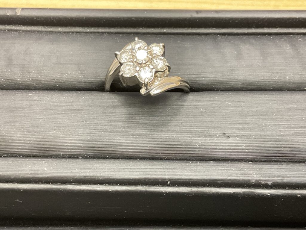 今回は、プラチナ製ダイヤリングの査定・買取りについて、少し踏み込んだ視点でお話ししてみます。お持ち込みいただいたのは、地金がPt900、ダイヤの合計が1.04ctという、フラワーモチーフのリング。ジュエリーとしてのデザイン性もしっかりあり、単なる素材価値だけでは語れないお品物です。