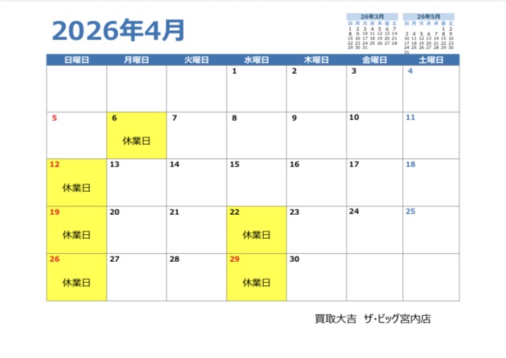 広島県 廿日市市 買取大吉ザ・ビッグ宮内店 4月営業日カレンダー🌸 | ザ・ビッグ宮内店