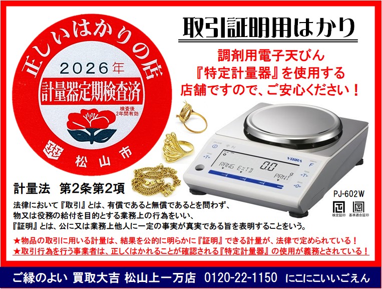 買取大吉» 店舗紹介» 松山上一万駅前店» 松山上一万駅前店 店長ブログ» 正しいはかりの店舗!【計量法・特定計量器使用/定期検査済】      ご縁のよい買取大吉 松山上一万駅前店におまかせ下さい♪