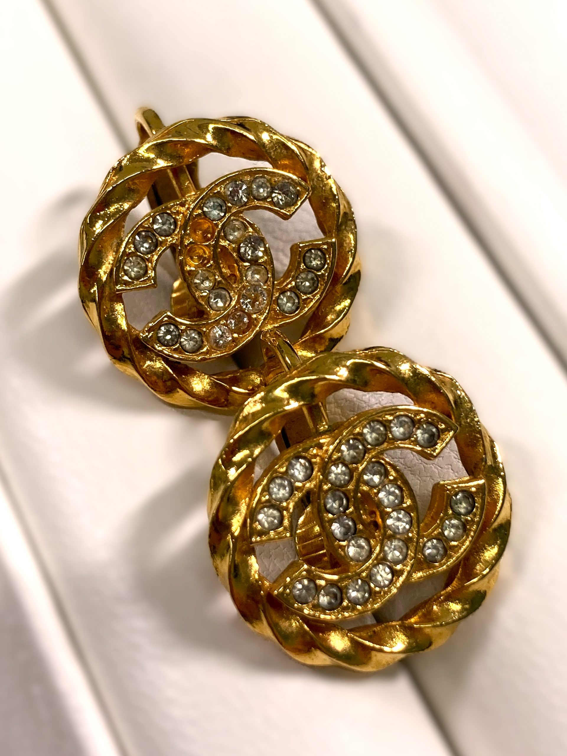 実は今、世界中で「ヴィンテージシャネル」が空前の大ブーム! 特にこうした大振りでゴールドカラーのデザインは、状態によっては当時の定価を上回るお値段がつくこともあるんです。✨ • ラインストーンが数箇所取れている • 裏のゴムが劣化してベタついている • 片方しか残っていない