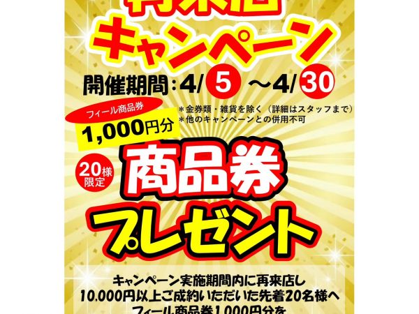 🎉 再来店キャンペーン好評に付き!開催中! 🎉