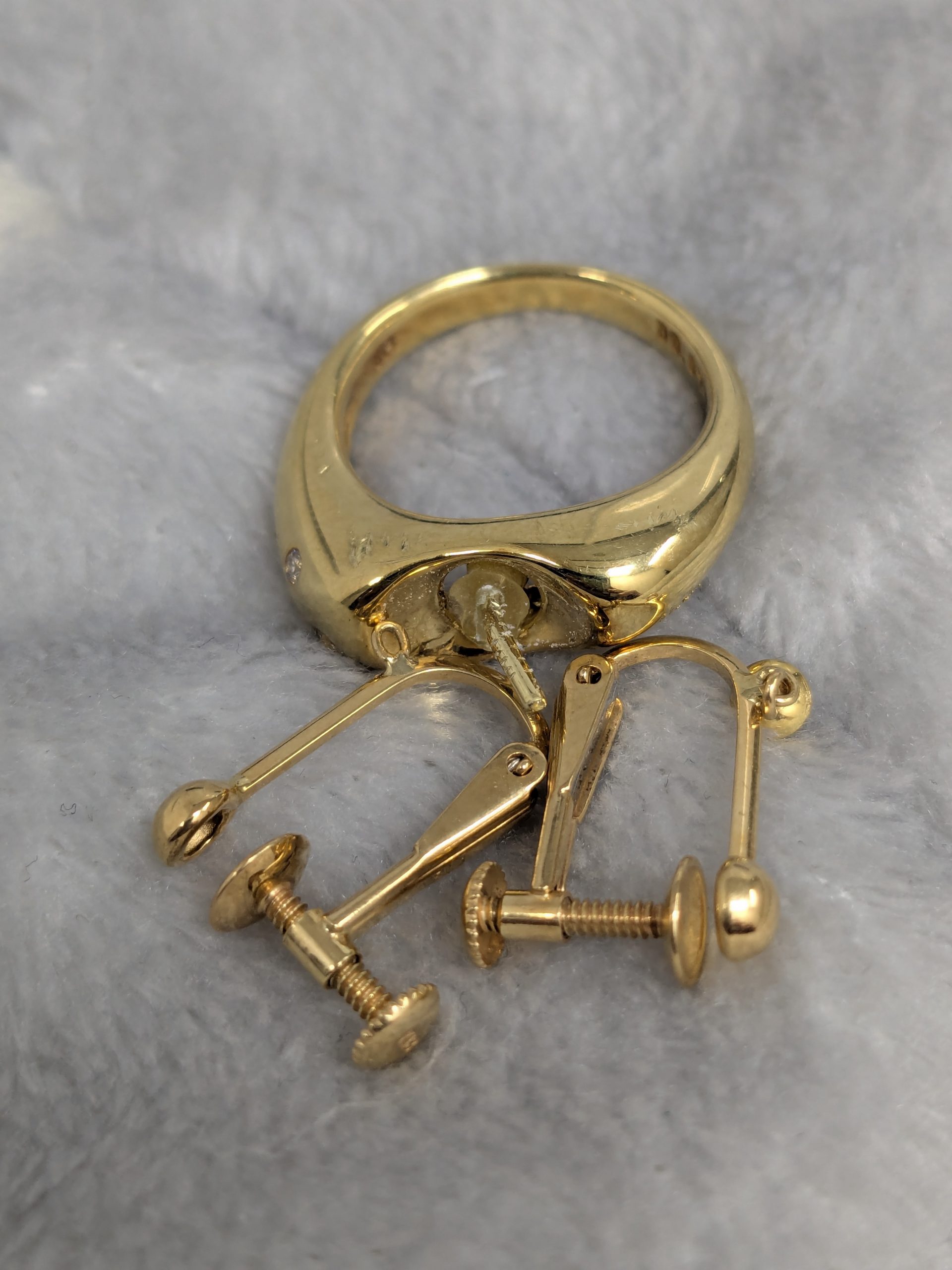 今回は、トップのパールが取れたK18リングとイヤリングをお買取りさせていただきました。