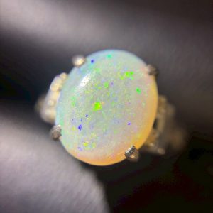 オパールのカラーは非常にバリエーション豊富で、白、黒、赤、青、緑、オレンジなど、さまざまな色合いが見られます。そして、見る角度によって違った色に見える「遊色効果」が特徴です。特に、ブラックオパールは黒い地色と鮮やかな遊色効果が魅力的で、高価な種類として知られています。他にもグリーンオパールやホワイトオパールなど、色がより鮮明なものもあります。