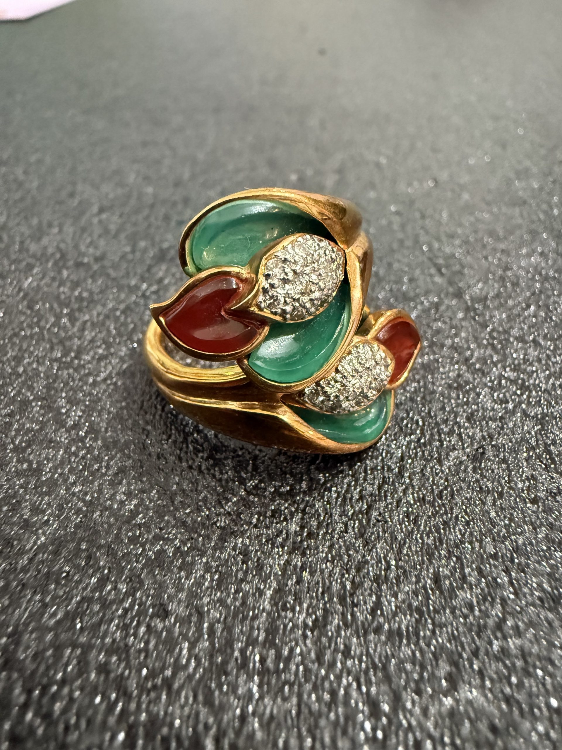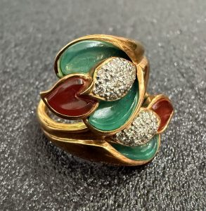 メレダイヤの繊細な輝きとグリーン・レッドのカラーストーンが組み合わさった、華やかで存在感のあるデザインリングです✨