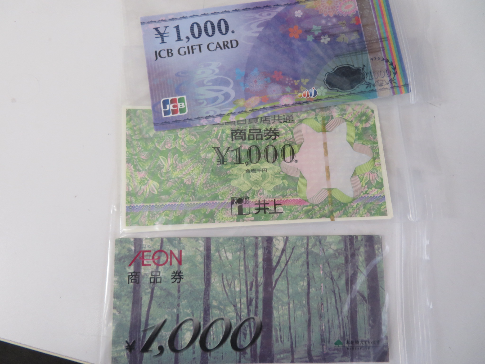 金券、商品券、JCBギフトカード、イオン商品券、全国百貨店共通商品券です。