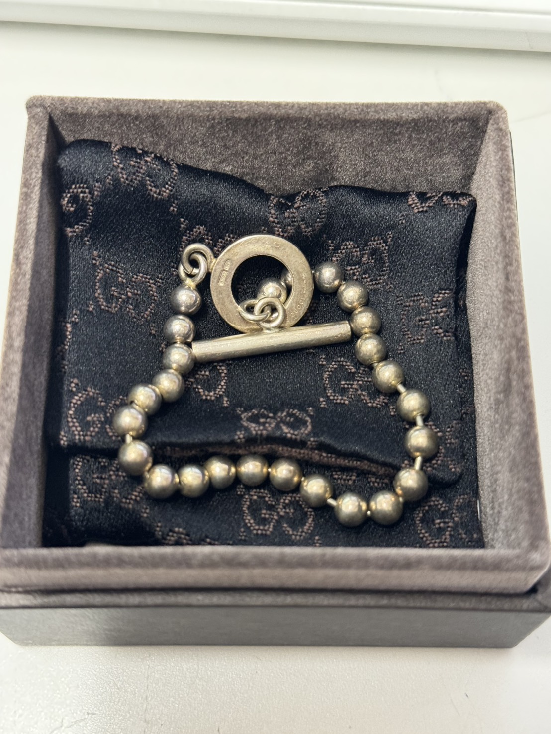 こちらのブレスレットは、シルバー製の丸みのあるボールが連なったデザインに、トグルクラスプと呼ばれる棒と輪のシンプルなクロージャーが組み合わさった、グッチらしいエレガントな一品です。専用のグッチボックスとポーチもセットでお持ちいただき、大変良好な状態でのお買取りとなりました。