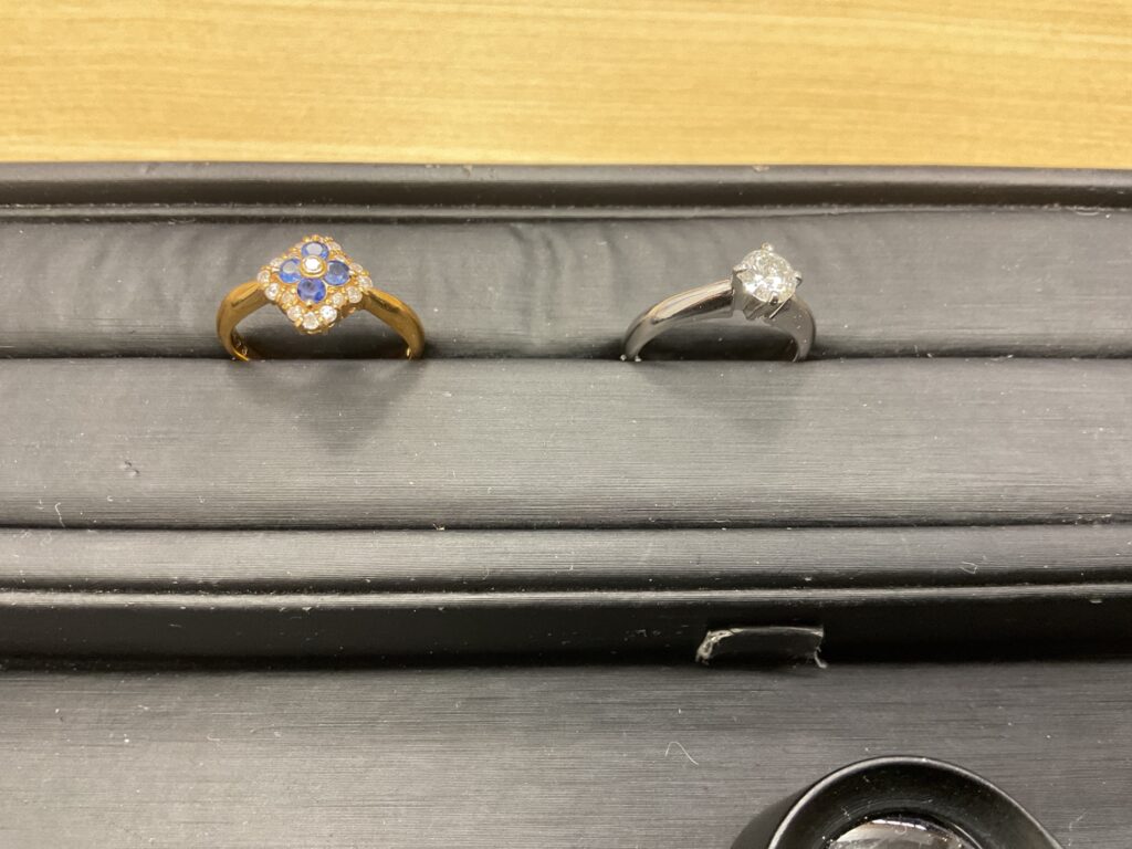 今回ご持参いただいたのは、K18のサファイアとダイヤモンドが組み合わさったコンビリング、そしてダイヤモンドを1石立爪でセットしたホワイトゴールドのリングの2点です。どちらも素材としての価値はもちろんですが、それだけでは語れない魅力を持ったお品物でした。