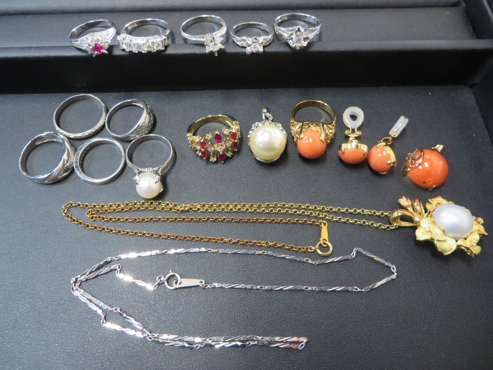 プラチナダイヤモンドリングやパールや珊瑚のついたリングにネックレス等々!