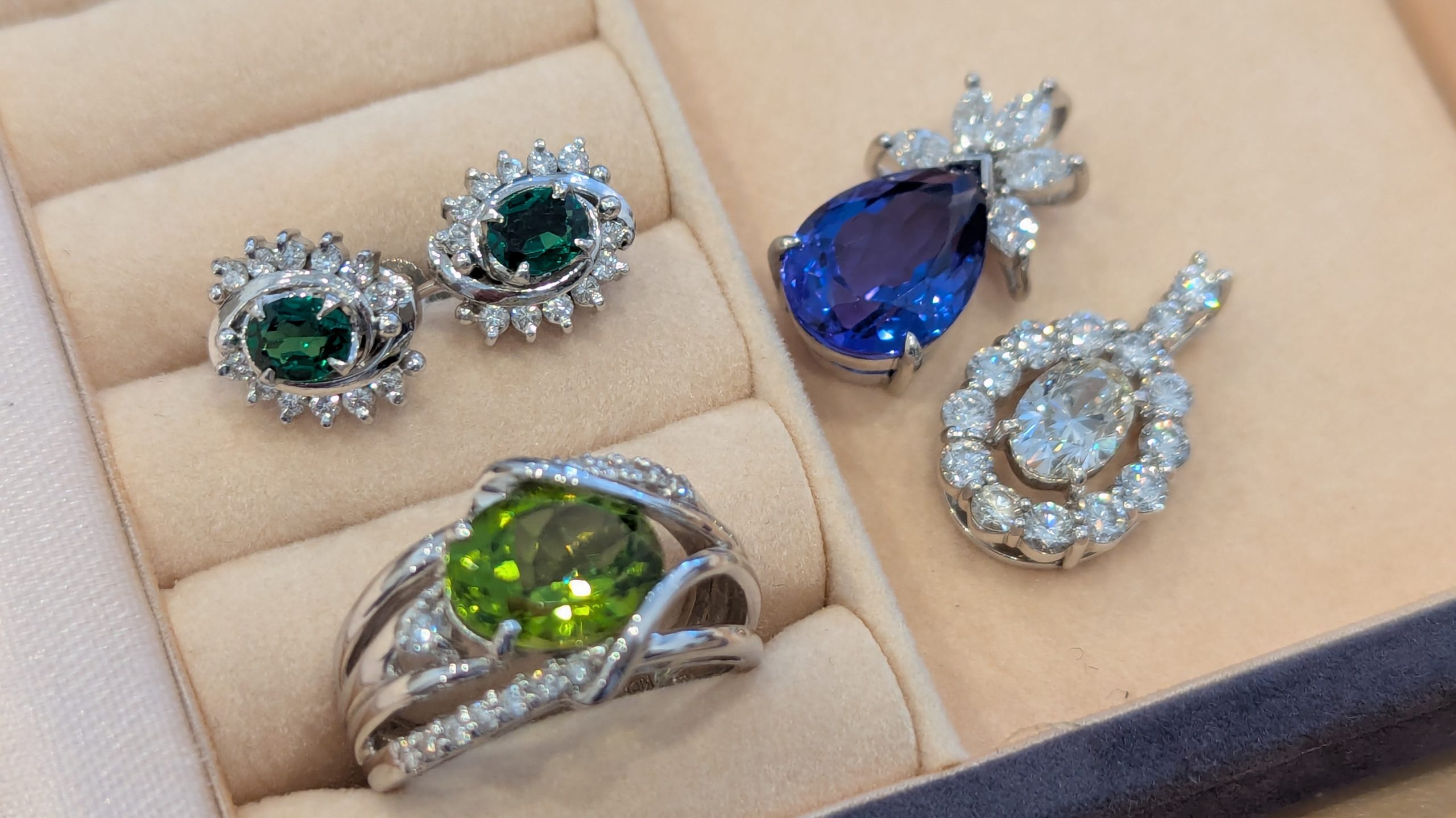 ダイヤ、ルビー、エメラルド、サファイア、タンザナイト、ペリドットなど、
