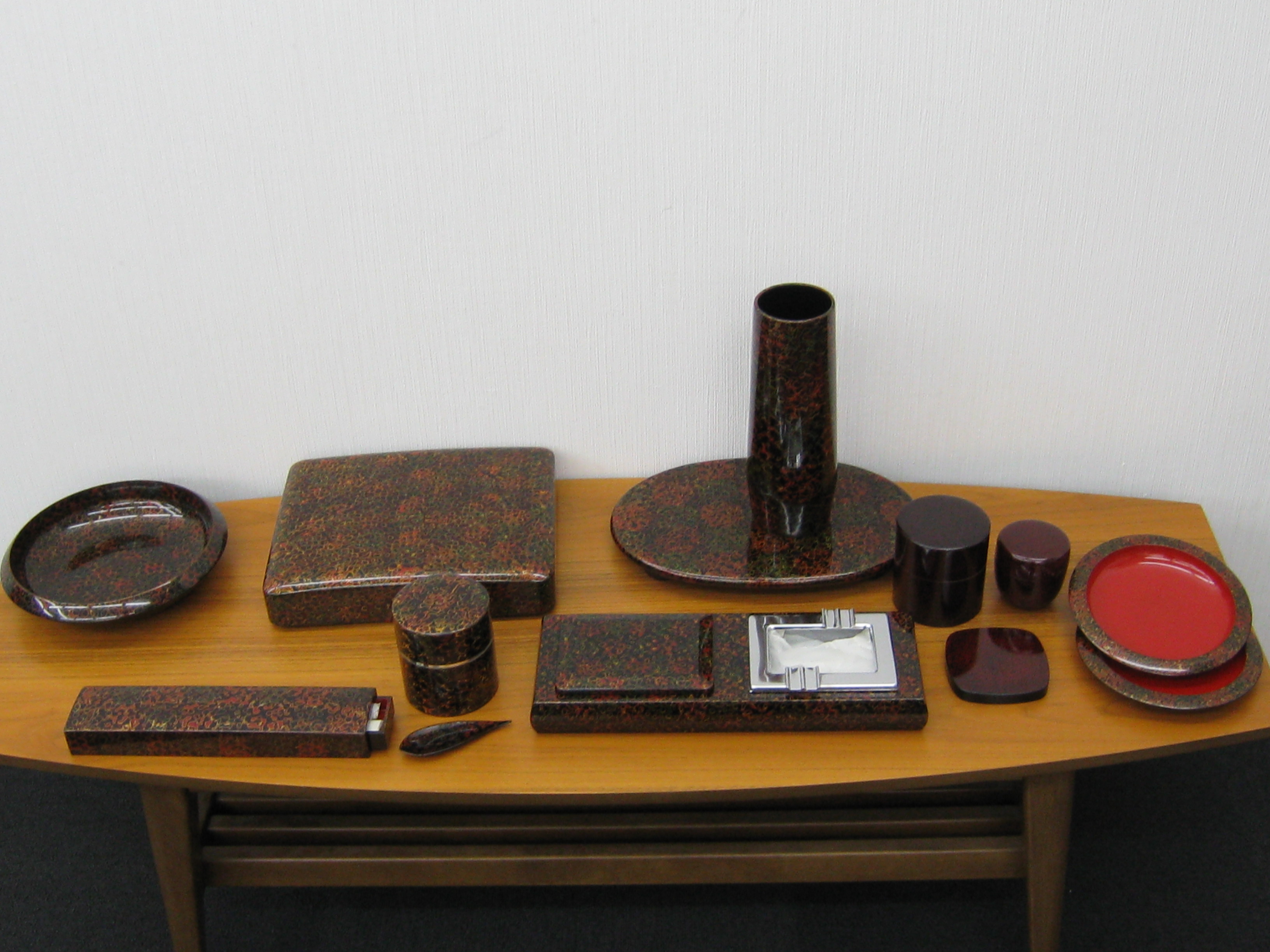 こちらのお品、津軽塗の茶器、花器一式でございます。