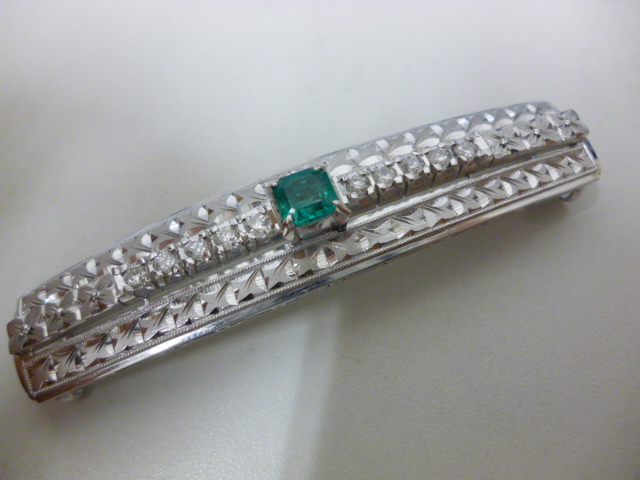 地金はプラチナで、中心にエメラルドと周りにメレダイヤがきれいな貴金属です。