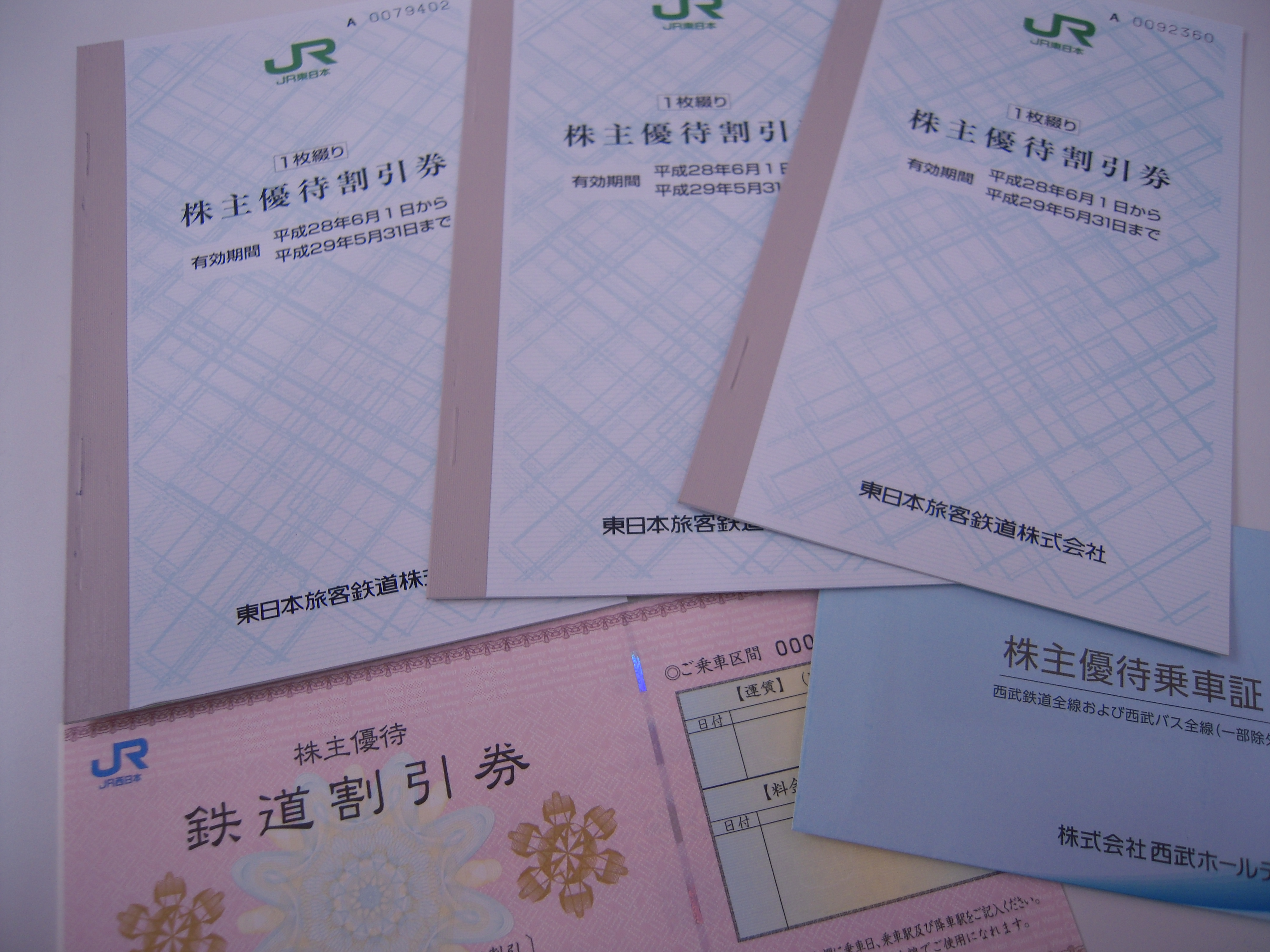 こちら、先日お売り頂きました株主優待券、JR東日本、JR西日本、西武ホールディングス(西武鉄道)の割引券、乗車券となります