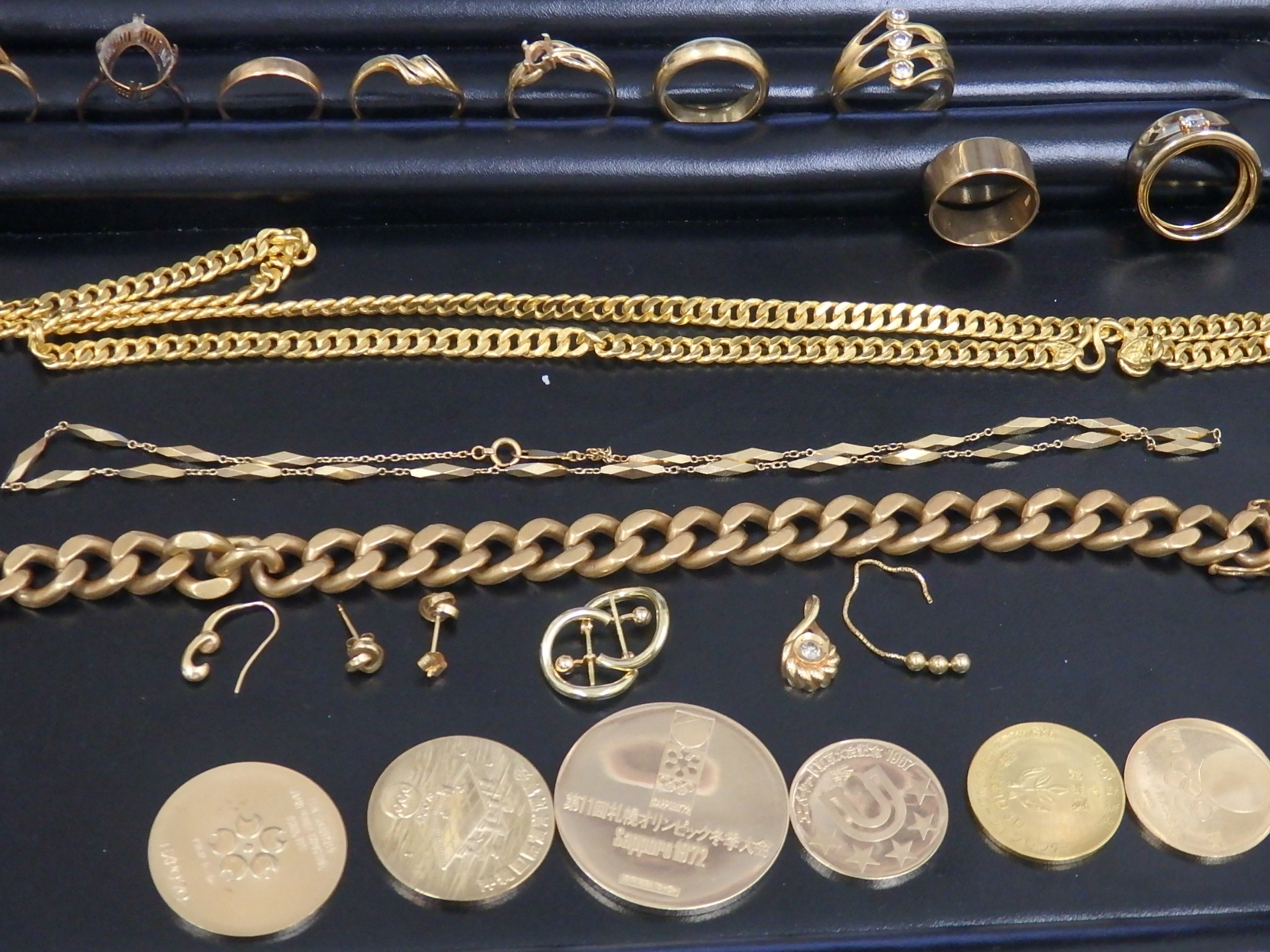 金のネックレス、ブレスレット、記念金メダル等沢山の金プラチナをお買取致しました。大吉住道店では切れてしまったネックレス、歯の付