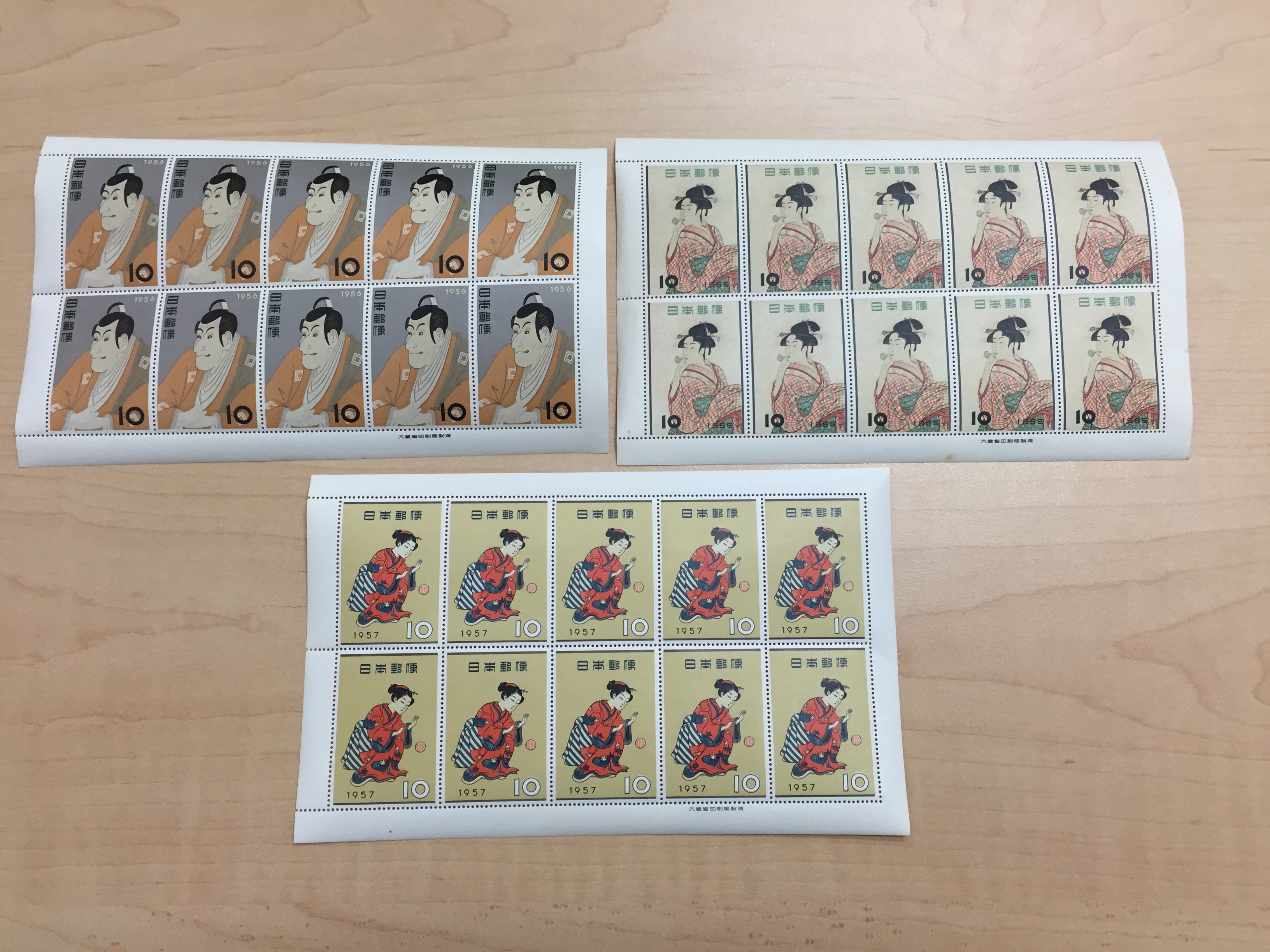 海老蔵・ビードロをふく娘・まりつきという切手シートです。