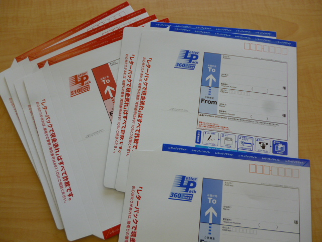 赤いレターパックプラスと青いレターパックライトです。