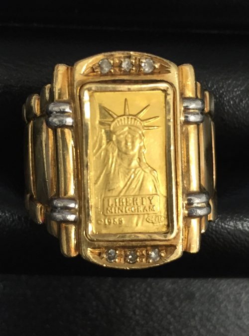 こちらの写真のリングがK18金とK24金でできたリングになります。中央の自由の女神がK24金になっています。
