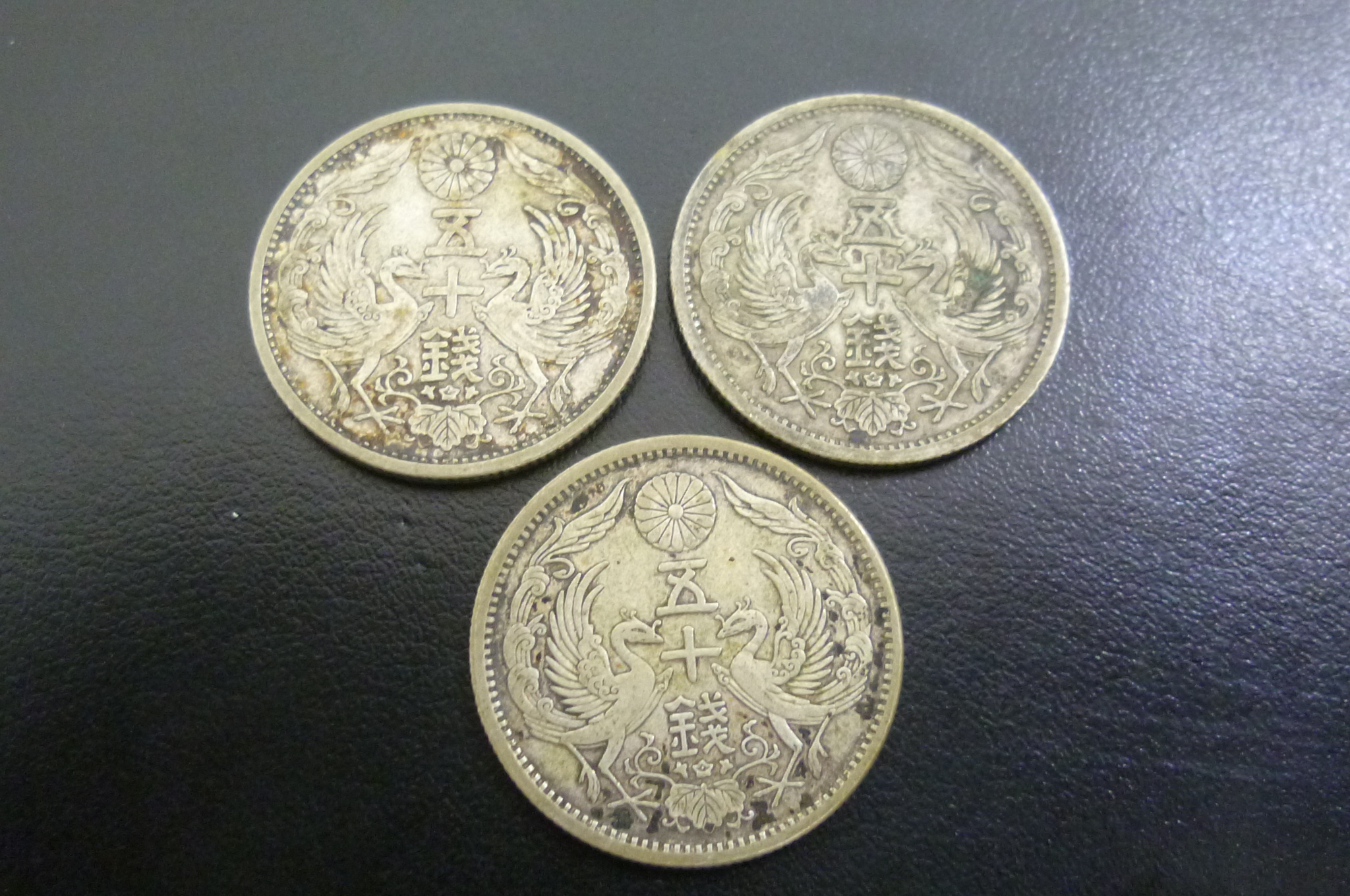 こちらのお品、大正12年、昭和3年、昭和8年の小型50銭銀貨でございます。