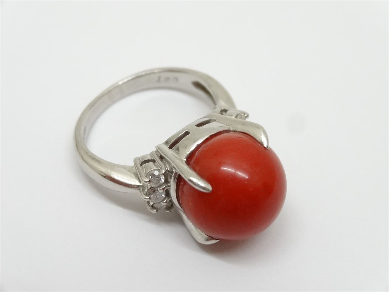 赤珊瑚が付いたプラチナの指輪です。