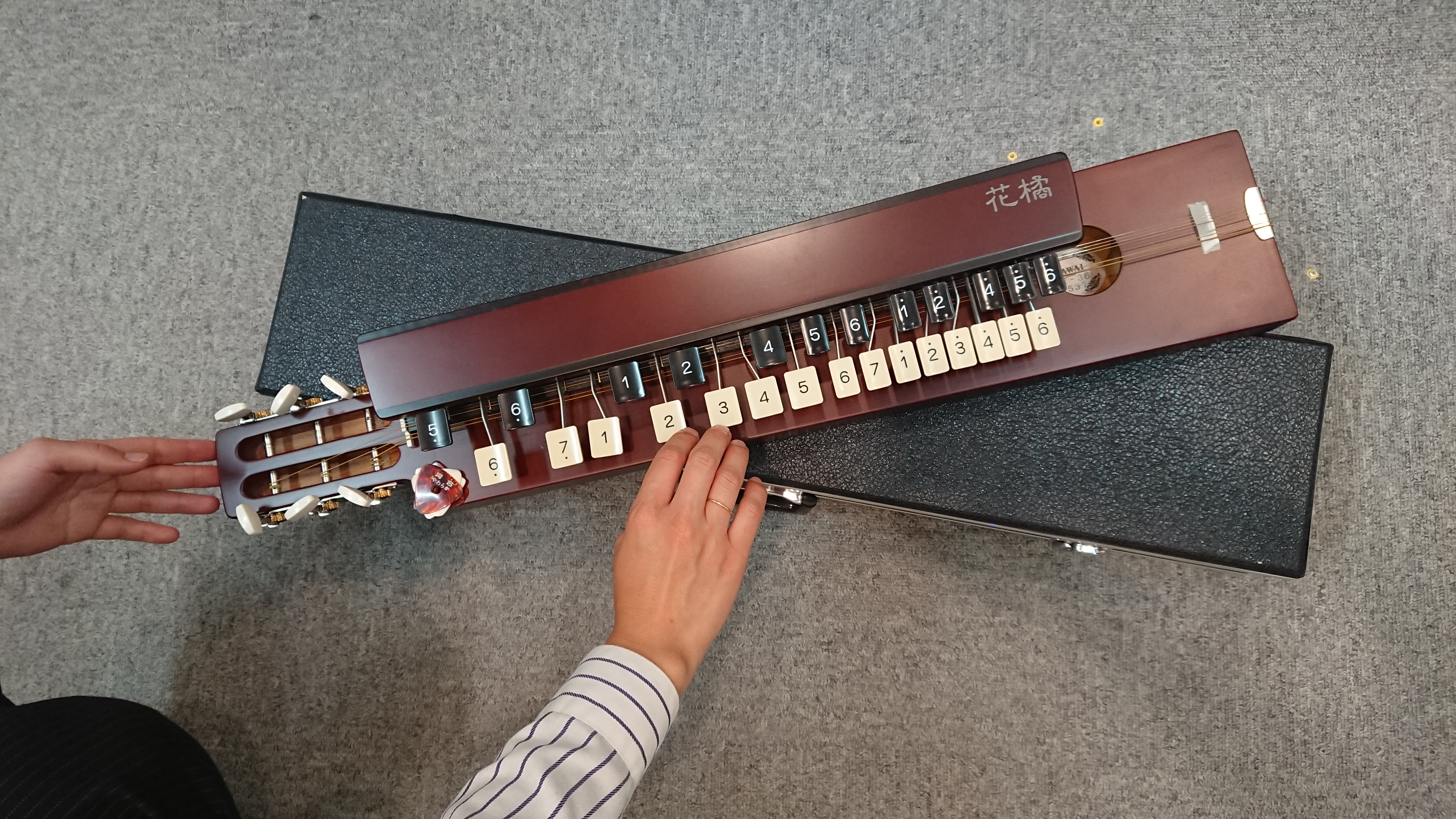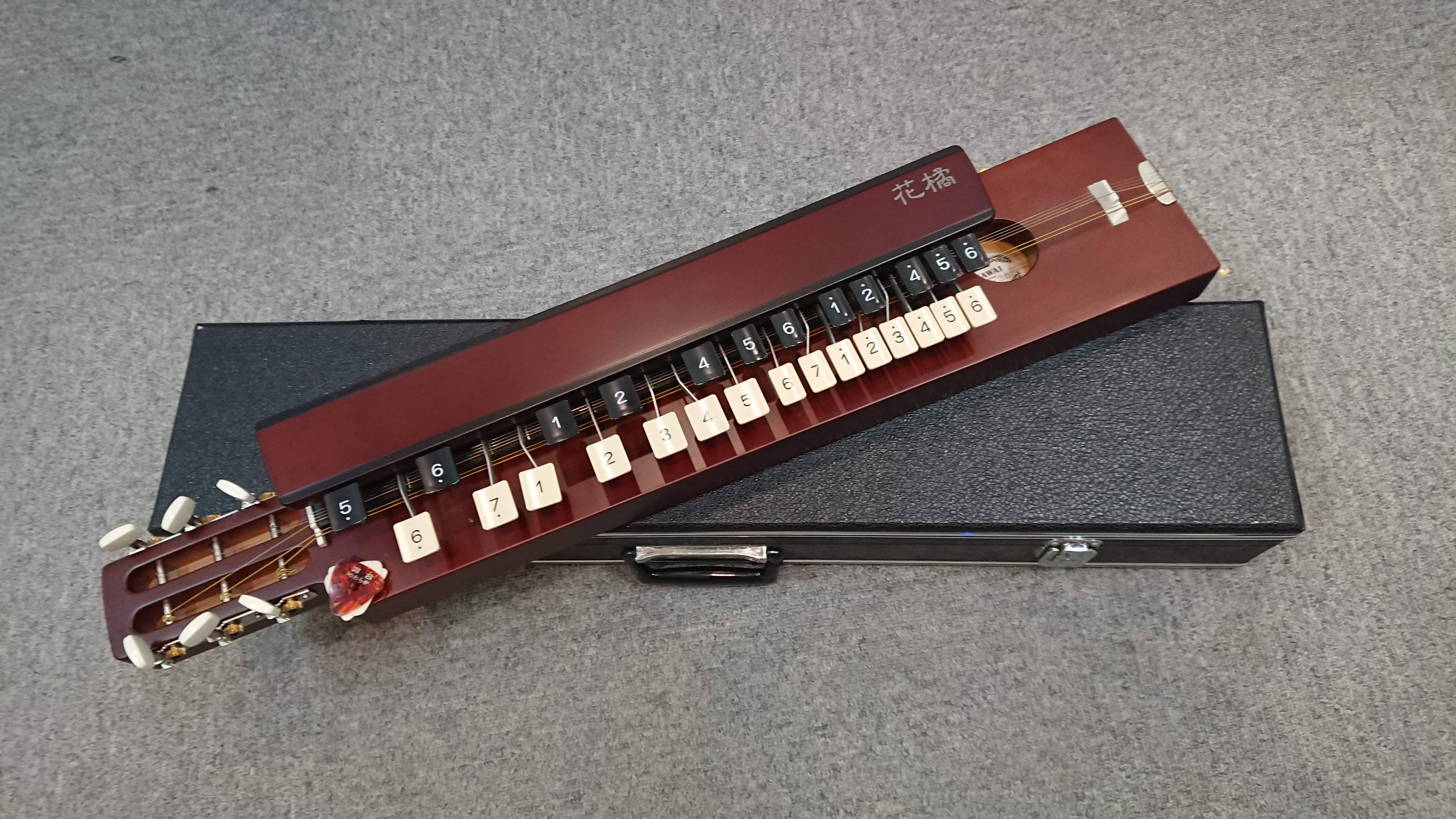 鍵盤を左手で押さえて右手の義甲で弾いて演奏する楽器です。