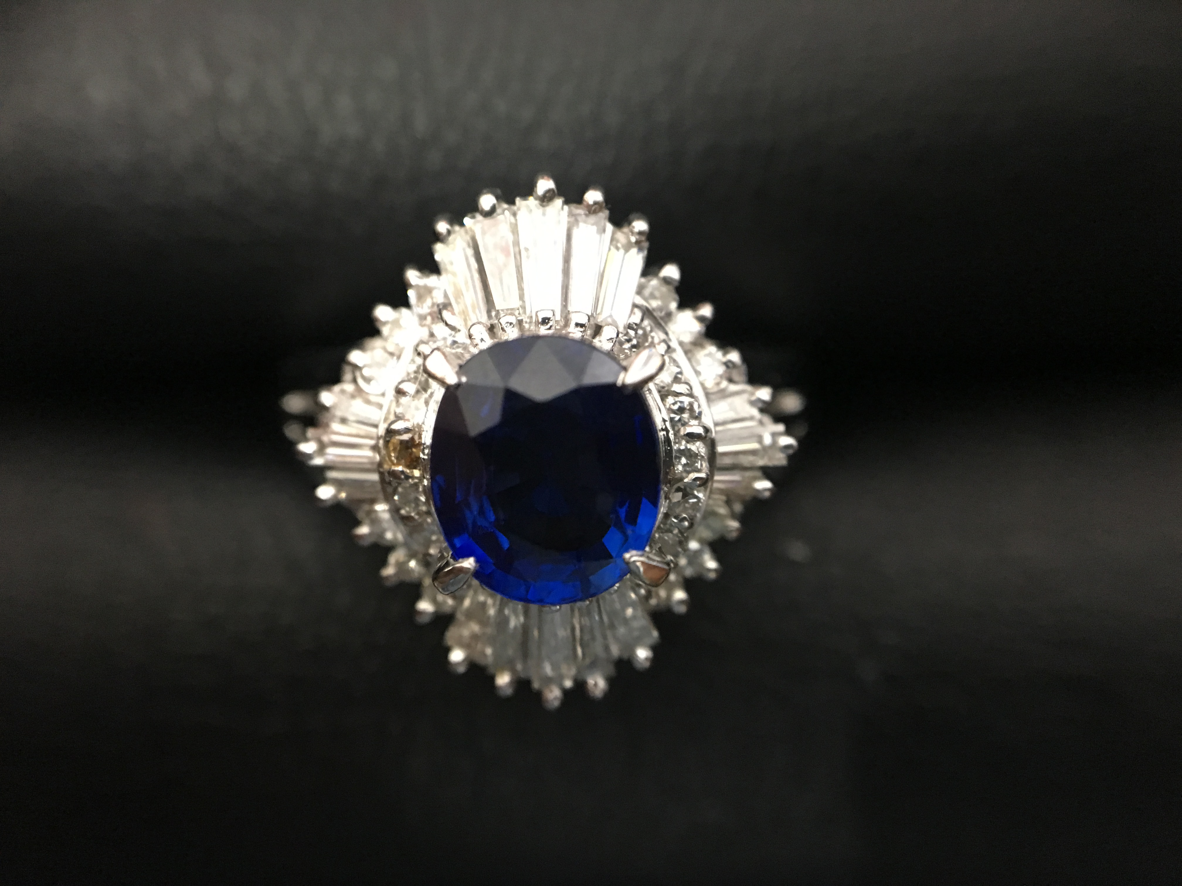 サファイアの大きさは1.11ctと若干小ぶりなものの、非常に深みのある青ですね。