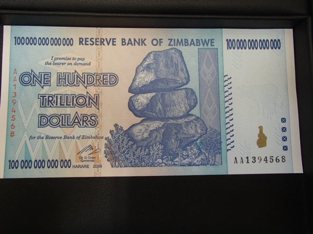 もはや為替レート上は意味を成し得ない、ジンバブエの100000000000000ドル札ですが