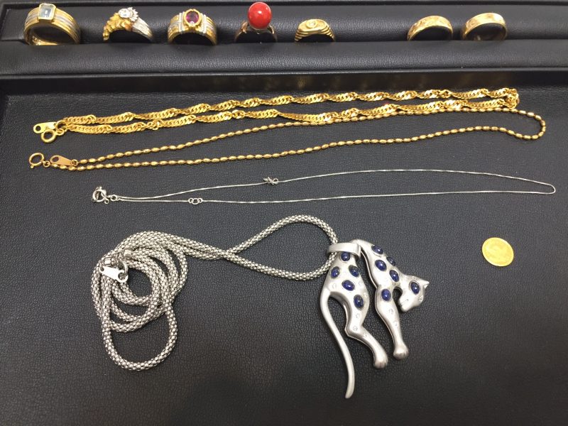 金、プラチナ、シルバーであれば千切れたネックレス、曲がった指輪、刻印が入ってる指輪等