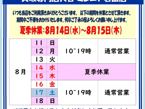 大吉ミレニア岩出店【夏季休業のお知らせ】