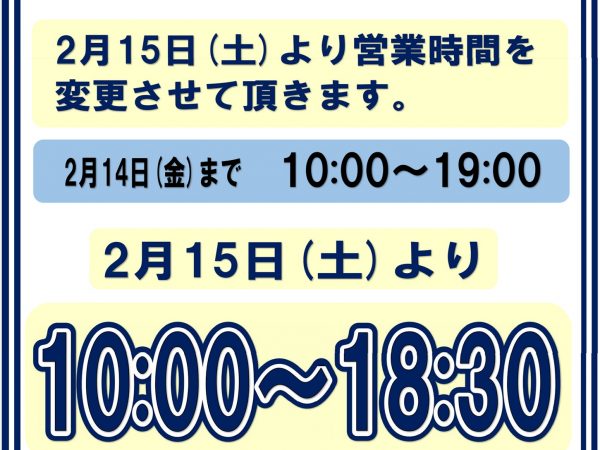 いつもご来店頂きありがとうございます。2025年2月15日(土)本日より下記の営業時間に変更となります。ご不便をおかけいたしますが、宜しくお願いいたします。■買取専門店大吉ミレニア岩出店■住所:和歌山県岩出市川尻31-5 ツインズビル1F(岩崎歯科様の隣、はしもと整形外科様向かいです)駐車場:ビル正面または向かって左手の空いている所に駐車をお願いいたします。フリーダイヤル:0120-121-252営業時間:10:00~19:00(2025年2月1...