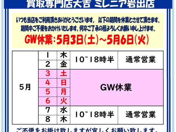 GW休業のお知らせ 買取専門店大吉ミレニア岩出店