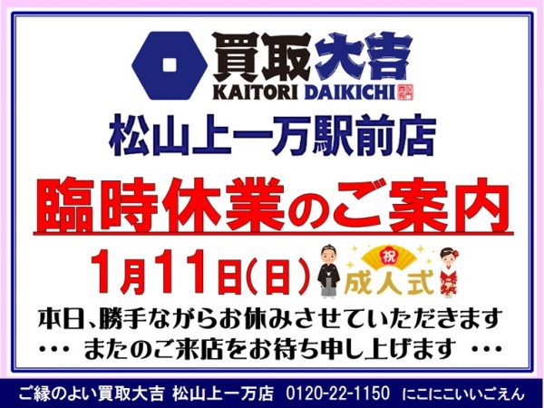 ◆1月11日(日)臨時休業のご案内!◆買取大吉松山古川椿店は営業しています!✅ お気軽にご来店ください ❝笑顔で明るく爽やかな❞おもてなし査定! ✅あなたの町の買取専門店 ご縁のよい買取大吉松山上一万駅前店! ✅キャンペーン情報! 2025年6月6日-OPEN ✅ご来店・ご成約のお客さま⇒日用品・食品・お菓子プレゼント! ✅ フジ商品券¥5000.~¥2000.が必ずもらえる、ポイントカード&ご紹介カード発行中! ✅地域に愛される松山城下町伊予鉄...