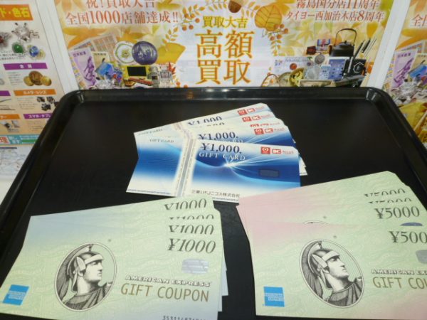 本日も姶良市・買取大吉タイヨー西加治木店からこんにちは~昨日までリフレッシュ休暇をいただき、本日復帰いたしました。家族旅行で東京まで行って参りました。楽しい思い出も作り、リフレッシュして、パワーアップして復帰しましたので、さらに高価お買取間違いなしでございます!本日よりまたよろしくお願いいたします。さて本日は三菱UFJニコスのギフトカードとアメリカンエキスプレスのギフトカードをお買取いたしました。三菱UFJニコスのギフトカードは約10年前の旧柄、...