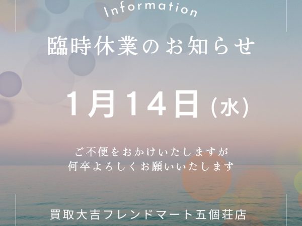 滋賀県東近江市・近江八幡市・彦根市・長浜市・愛知郡・犬上郡・愛荘町・豊郷町・甲良町・多賀町・安土町にお住まいの皆さま、いつもご愛顧ありがとうございます!買取大吉フレンドマート五個荘店です('ω')おはようございます\('ω')/クサノです本日はお知らせです💡<臨時休業のお知らせ>明後日、令和8年1月14日(水)は臨時休業させていただきます!!大変ご迷惑をおかけいたします。本日、令和8年1月12日(月)は通常営業しております 😳1月15日(木)10...