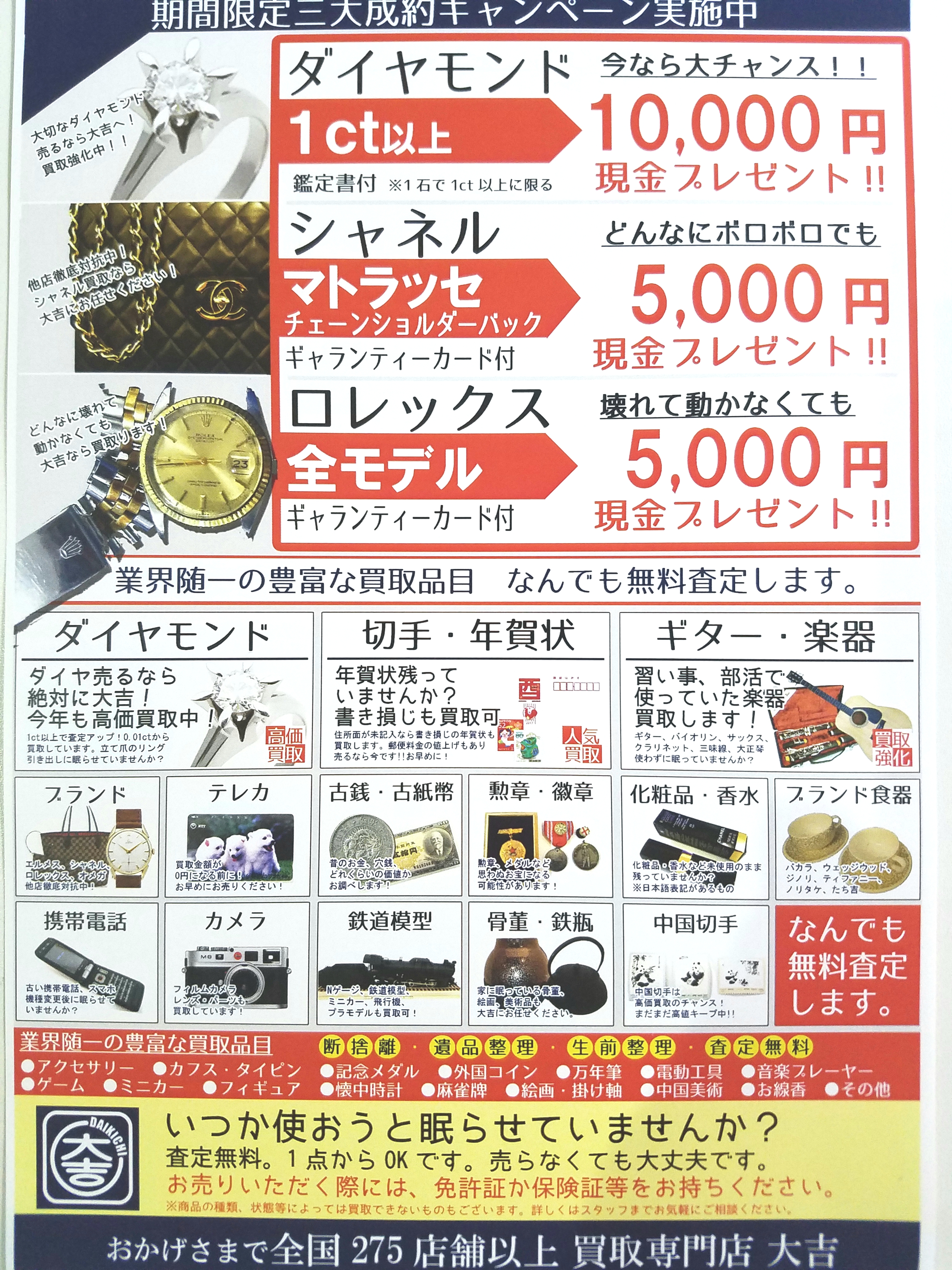 7月31日まで!!ダイヤ、シャネル、ロレックス、三大成約キャンペーン!!イズミヤ西神戸店明石市の大久保町にある大吉イズミヤ西神戸店です。兵庫県の皆様こんにちは!いつも大吉イズミヤ西神戸店のブログをご覧いただき誠にありがとうございます。さっそくではありますが、、、今回は皆様にキャンペーンのお知らせがあります!今月末の7月31日まで、こちらの商品を3大成約キャンペーンと題しまして、ご案内させて頂きます!今回キャンペーンをしておりますのはこちら!ダイヤ...