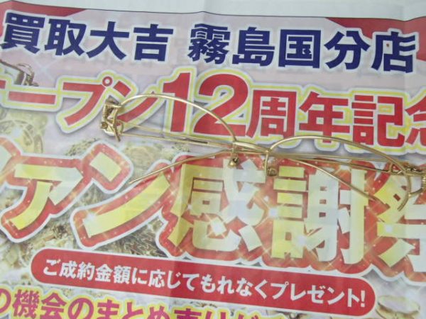 鹿児島、霧島市、姶良市、曽於市、都城市、国分、隼人、加治木にお住いの皆さま・お仕事されてる皆さま、こんにちは!オープン12周年記念ファン感謝祭開催中の霧島市の買取大吉霧島国分店です。今日も肉が出るぞー!!!さてさて、金相場は小康状態ということでお持ち込みも多くなっておりますね。金縁メガネをお買取させていただきました!金メッキの眼鏡も多いですが、K18・K14・K10などしっかり金が使われているものも多いので、使わなくなったメガネや遺品整理で出てき...