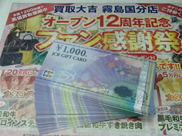 鹿児島、霧島市、姶良市、曽於市、都城市、国分、隼人、加治木にお住いの皆さま・お仕事されてる皆さま、こんにちは!オープン12周年記念ファン感謝祭開催中の霧島市の買取大吉霧島国分店です。本日はJCBギフトカードを大量にお買取いたしました!スマートフォン購入のキャッシュバックでもらった、各種イベントでもらった、だけど使える場所が限られているから、現金化したい!そんなときは霧島市の買取大吉霧島国分店におまかせください!いただいたギフトカードはそのまま使う...