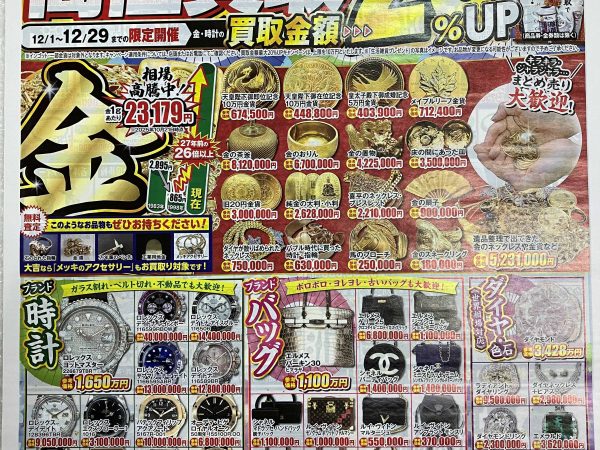 買取大吉マルシェ下北沢店.では12/29(月)まで買取キャンペーンを開催中です。年内特別キャンペーンも実施しております。金価格高騰のおり、お急ぎ下さいませ。--------------------------------------------------------買取大吉マルシェ下北沢店.では店内で金の検査をした上でお買取しております。無料査定後に売るか?売らないか?お決め頂いてOKです。「コレ売れるのかな?」と思ったらお気軽に買取大吉マルシ...