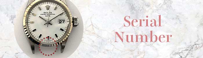 デイデイトでは、文字盤側面(ルーレット部分)の6時位置、または本体の6時側(ベルトを外した状態)に深く刻印されています。存在しない番号や、レーザーで浅く刻印されたものは偽物の特徴の一つです。
